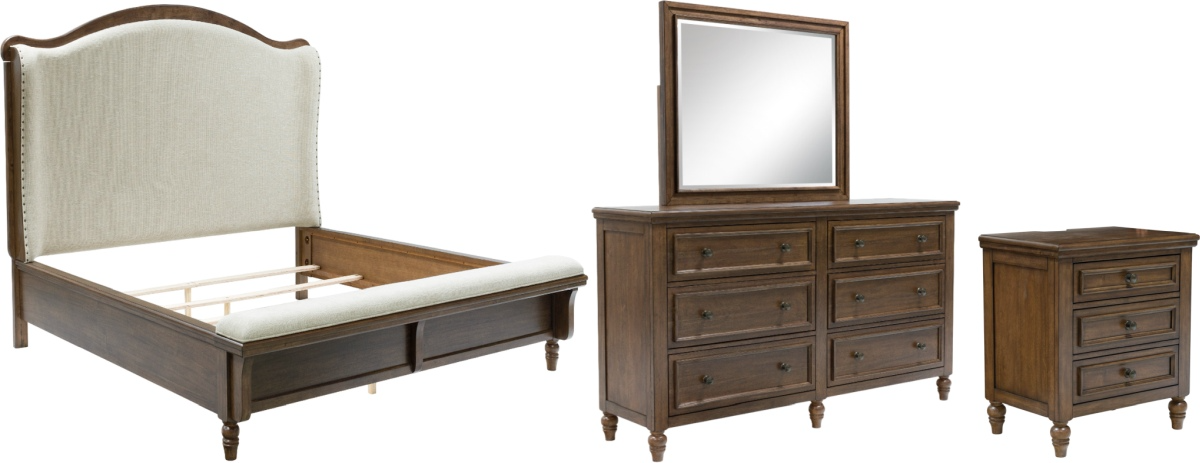 Benchcraft® Sturlayne 4-Piece Brown Queen Upholstered Panel Bedroom Set features a complex rich brown finish that contrasts perfectly with the oil rubbed bronze tone hardware. Case designs feature thick profiled tops with inset drawers, turned feet, and a simple traditional bead moulding on each drawer front. Read More