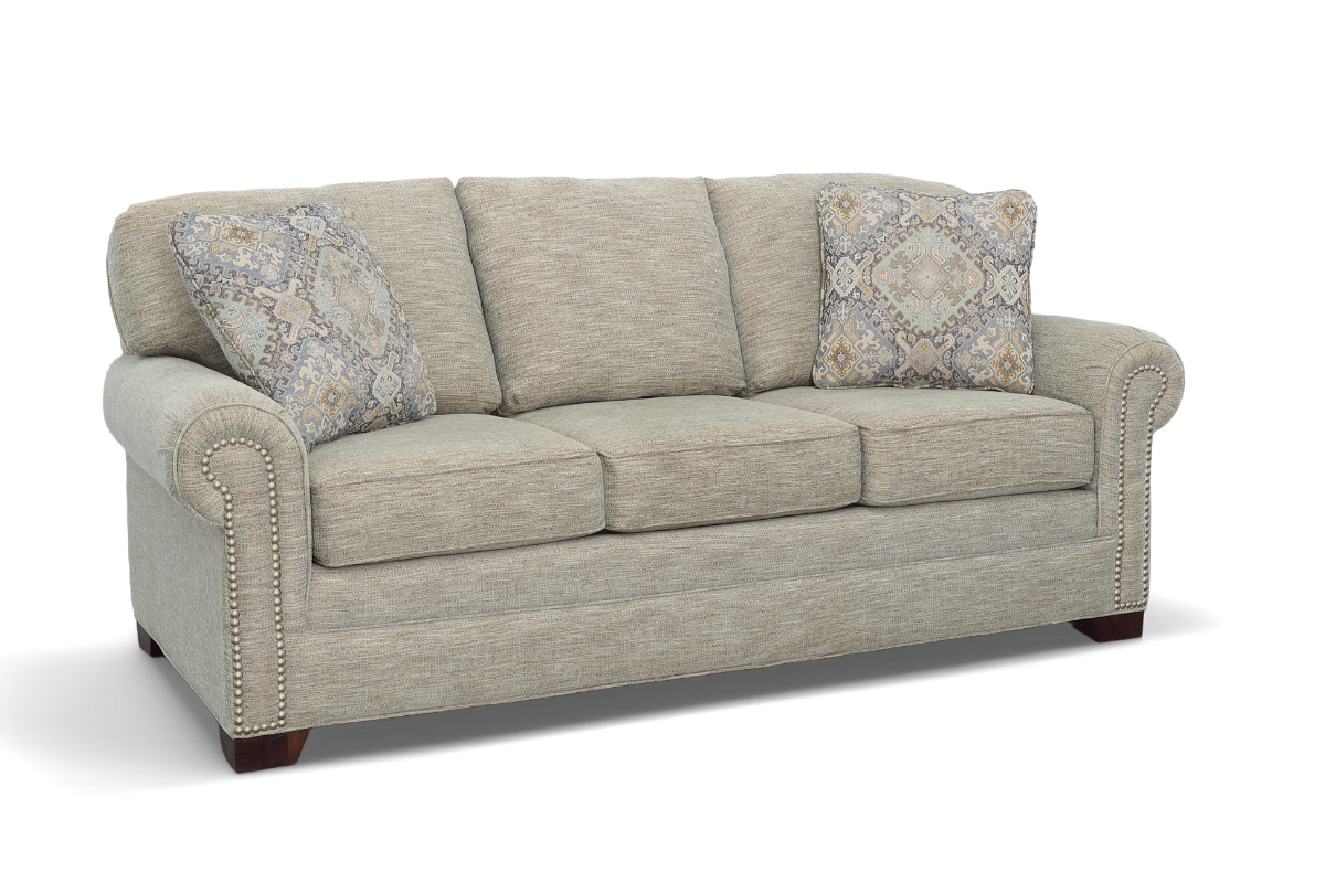 <p>Casual sophistication comes to life in this updated classic sofa. Pewter nail heads trim the arm panels and accent the pleated rolled arms- set at the perfect height for a good nap! Three seat cushions and three attached backs provide a plush, comfortable place to relax. Tapered block legs offer a modern touch to this simple, but refined look. Also available are the matching sleeper, loveseat, chair and ottoman.</p><ul><li>Cushion Type: Standard</li><li>Back Type: Attached Back</li><li>Seat Spring Type: Sinuous</li><li>Standard Wood Finish: Manhattan</li></ul><p>Craftmaster Furniture was founded over 45 years ago in the small town of Taylorsville North Carolina, where furniture manufacturing is not just our profession but a family tradition. Generations of North Carolinians have been building furniture in this part of the country dating back to the 1800’s.</p><p>On behalf of future generations, the products we produce in N.C. are also environmentally friendly. All our facilities are “EFEC” certified for best sustainable manufacturing practices and the materials we utilize all have “Earthcare Inside” in order to reduce our environmental footprint.</p><p>Craftmaster is also proud to be the exclusive upholstery producer of the Paula Deen Home Collection and the Rachael Ray Home Collection. Both are nationally known celebrity chefs who bring the warmth of their kitchens into your living room.</p><p>Whether it is durable furniture for active children or a luxurious leather sofa or that dining room set for family gatherings, you will find the brands you trust and the styles that fit your personality.</p><p> </p><p>*Sofa and 2 toss pillows only. Other items sold separately.</p>