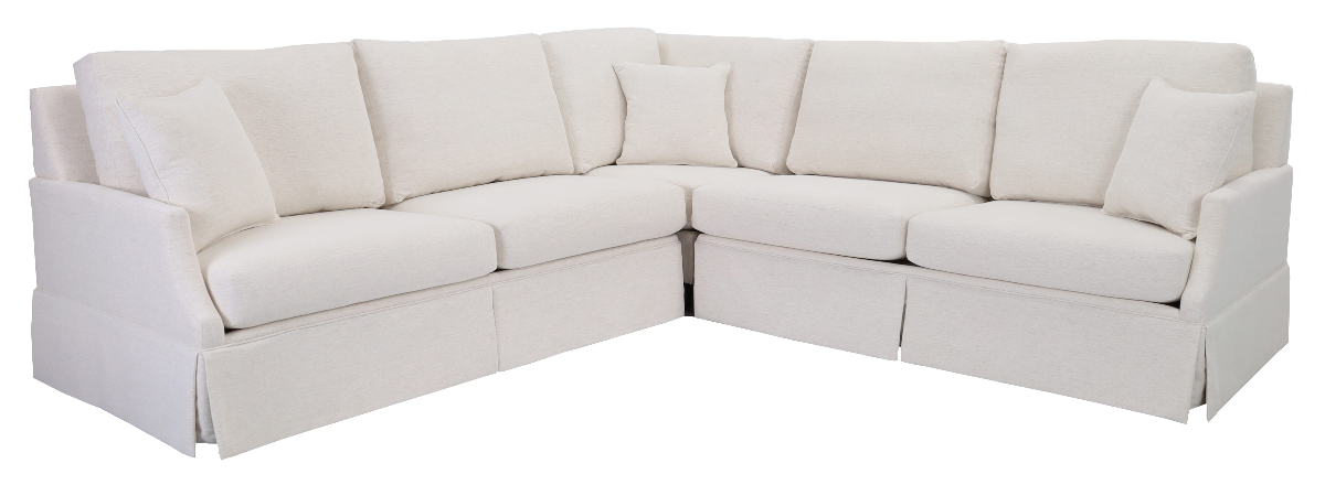 This skirted sectional features a LAF sofa, corner, and RAF sofa. It is in the Nomad Snow fabric which is a Crypton performance fabric to help keep it clean! Read More