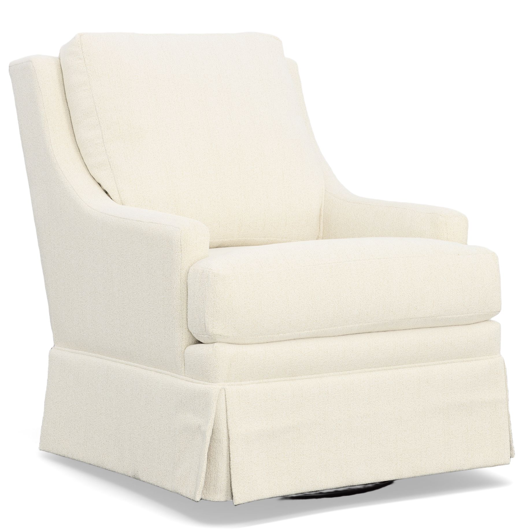 This swivel glider is in the Dalmation Eggshell Crypton performance fabric and features sloped arms with a skirted base.