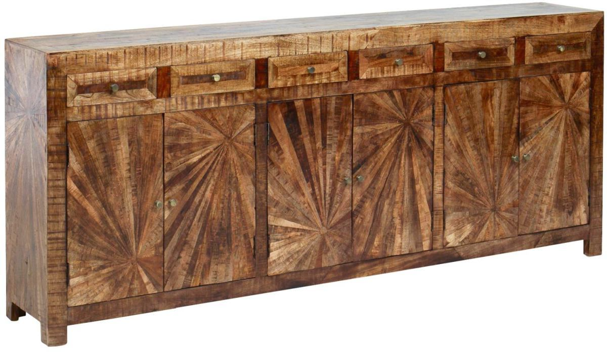 The Cayley group is constructed of mango wood and features a burnished hand-distressed finish. A solid case is built, and then the pinwheel effect is achieved using additional strips and circles of wood painstakingly hand set in a pleasing pattern. An impressive 97 inches long, the Jumbo Sideboard has 6 drawers and 6 doors which open to reveal shelved interior compartments. Read More