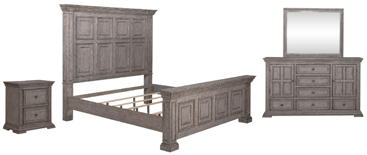 Liberty Big Valley 4-Piece Graystone King Panel Bedroom Set features full extension metal side drawer guides, french & english dovoetail construction, and antique pewter knob hardware. Read More