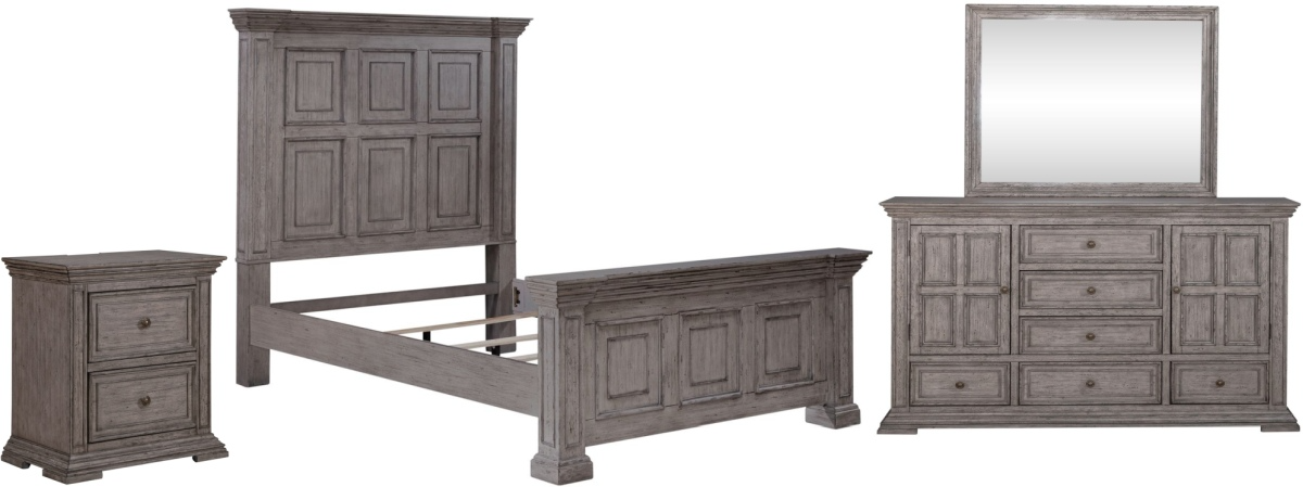 Liberty Big Valley 4-Piece Graystone Queen Panel Bedroom Set features full extension metal side drawer guides, french & english dovoetail construction, and antique pewter knob hardware. Read More