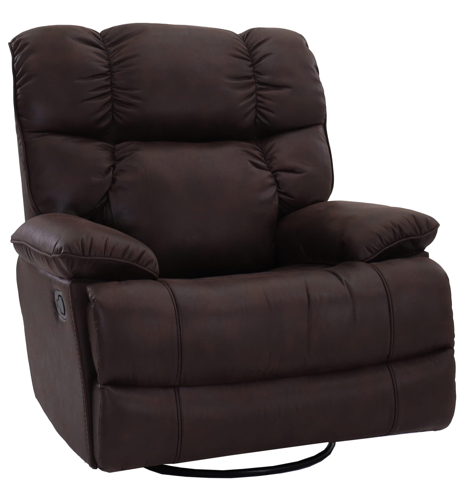 This swivel glider recliner by Man Wah features a pull tab on the side to recline. It is in the Cowboy Dark Brown fabric.