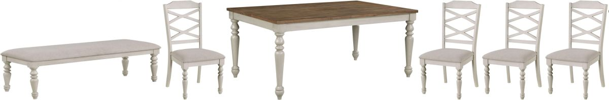 The Jennifer set is made from rubberwood solids with acacia veneers. It's painted brown color on the table top and white color on the base. The Jennifer dining chair has double X shape wood back in white. The Jennifer bench has turned legs. Read More