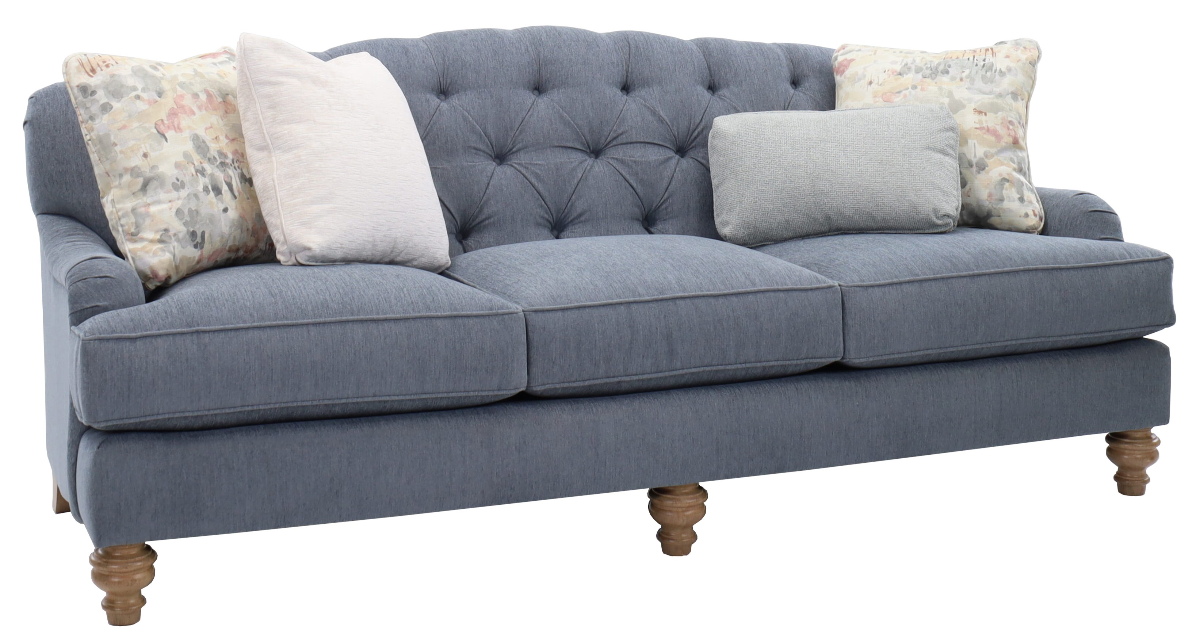 Along with the graceful curves along the top rail, the classic Charles of London arm and tufted back work in harmony to create a welcoming, casual look that invites you to settle in for a while. Featuring exquisite turned legs and four accent pillows, this piece also incorporates amazing comfort and durability