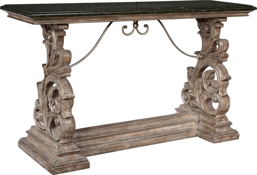 Intricate detail and exuberant design unite to create a luxurious piece in this Italianate-styled Marble top Console Table, featuring a black marble top with an ogee edge supported by a trestle base displaying detailed carving. An ornate metal stretcher exhibits beautiful scrollwork underneath the tabletop, adding more elegant detail to this piece. Read More