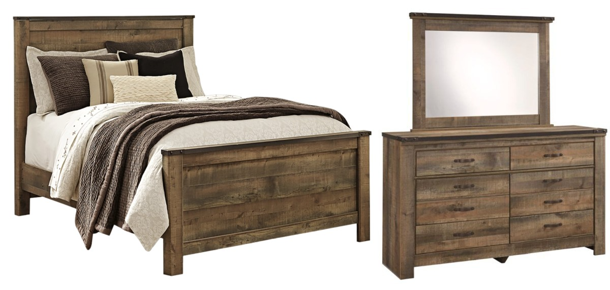 Includes queen bed (headboard, footboard and rails), dresser, and mirror