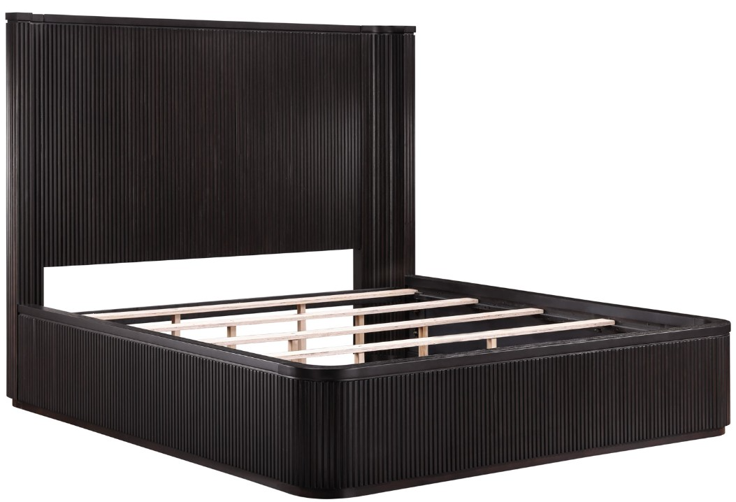 The king bed boasts elegant styling with reeded detailing, gently shaped corners, and a sturdy plinth base for added stability