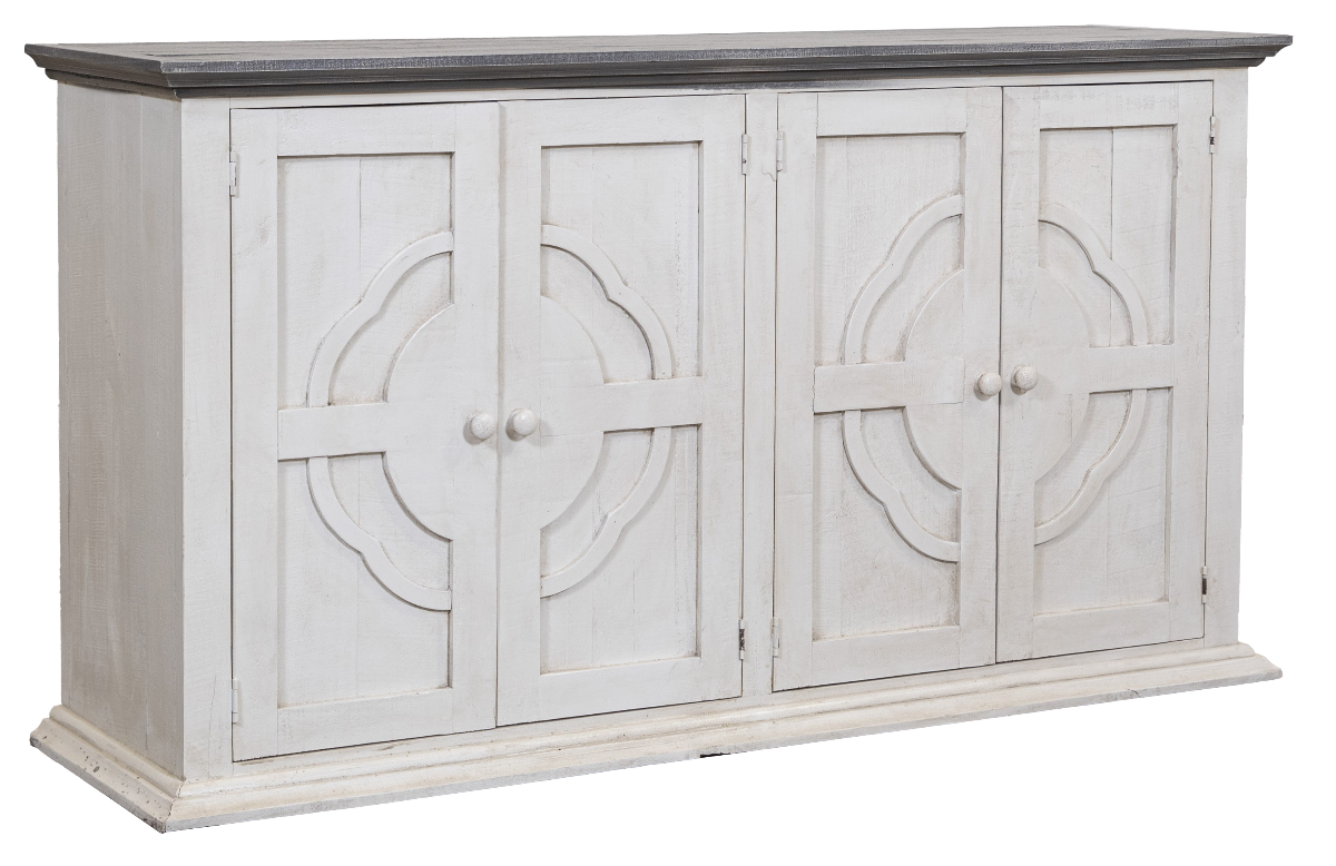 Beth Console by Vintage Furniture made of solid wood featuring 4 doors and a shelf for storage inside. Vintage Furniture is handmade of solid wood construction and all hand-finished to create a unique quality look made to the highest standards of craftsmanship.
