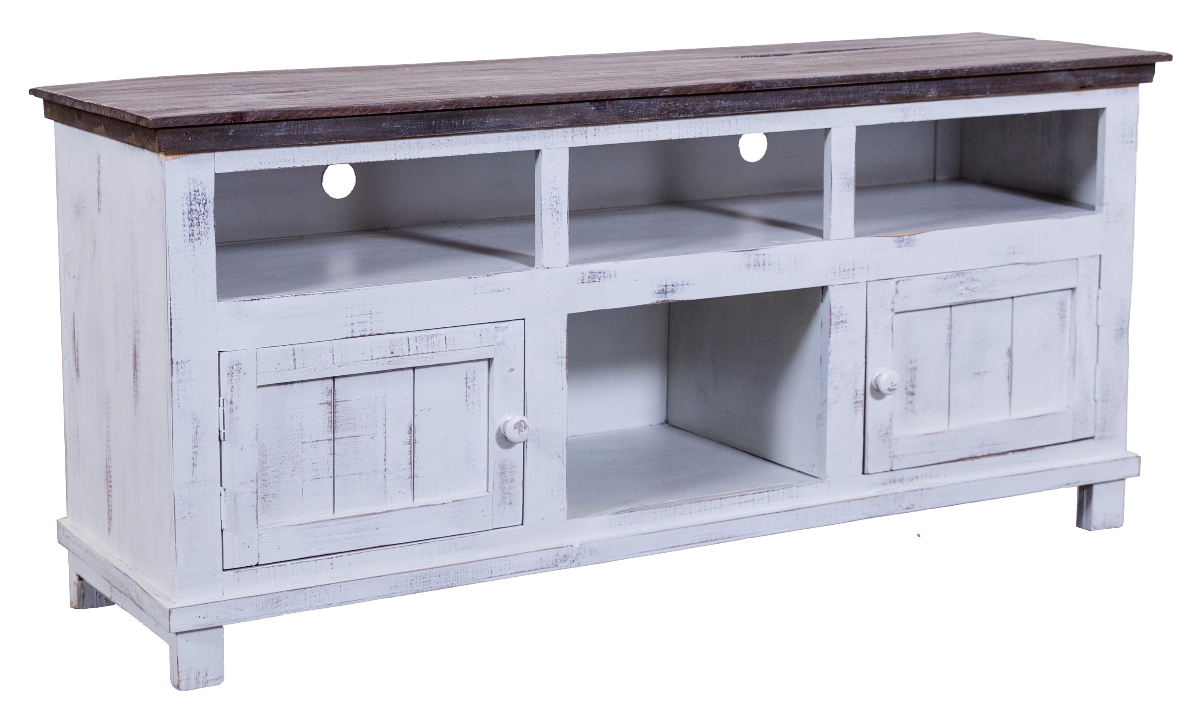 Burch TV Console by Vintage Furniture in a Nash finish and featuring shelving and two doors. Vintage Furniture is handmade of solid wood construction and all hand-finished to create a unique quality look made to the highest standards of craftsmanship.