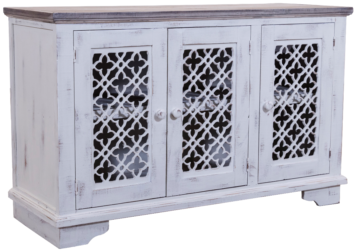 Lacy Console by Vintage Furniture featuring 3 doors and shelving inside for storage. Vintage Furniture is handmade of solid wood construction and all hand-finished to create a unique quality look made to the highest standards of craftsmanship.