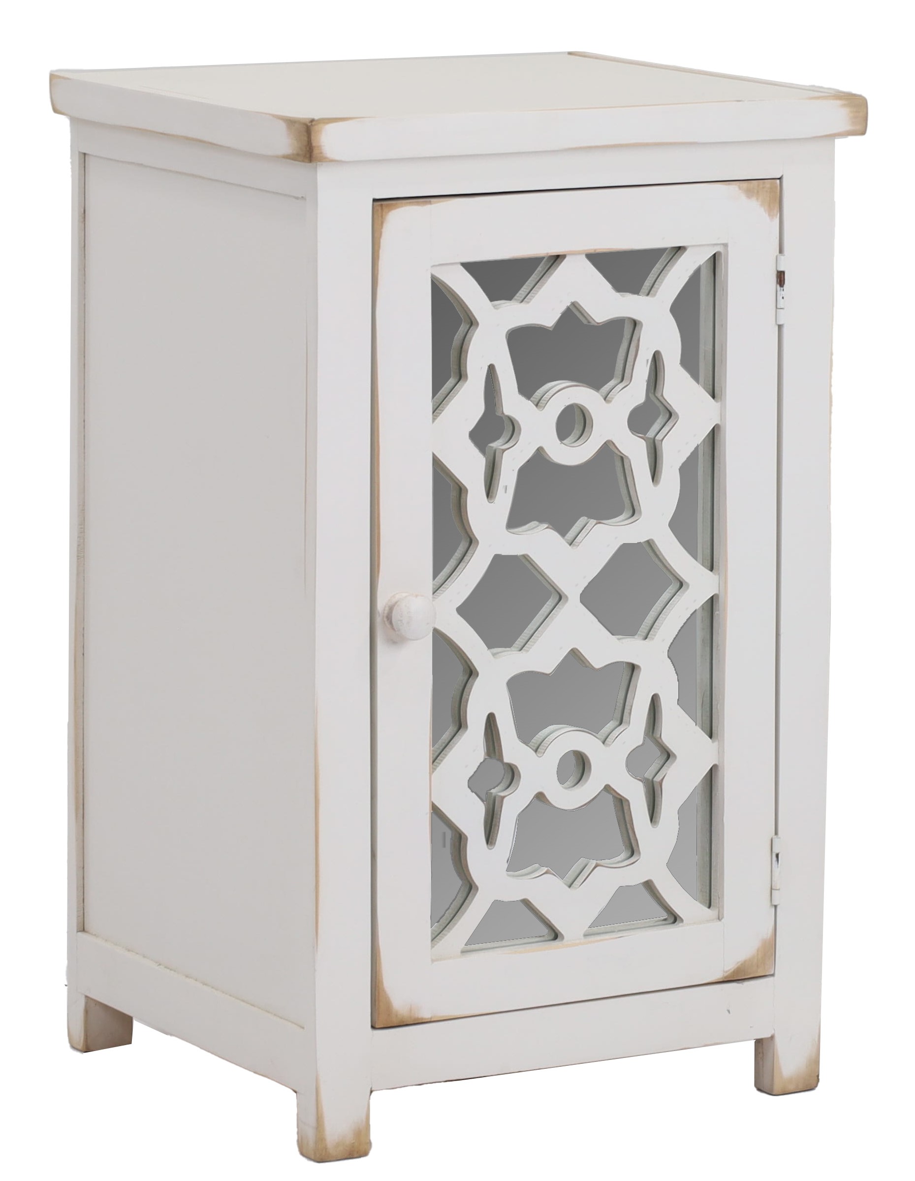 Niko side table featuring beautiful overlay on the mirrored front. Mirrored door opens for storage inside. Read More