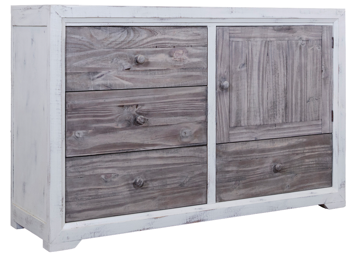 This Windjammer dresser by Vintage furniture features a Nero White rustic finish with a Granite contrast finish on the drawers and door. This dresser features 4 different drawers and a door. Vintage Furniture is handmade of solid wood construction and all hand-finished to create a unique quality look made to the highest standards of craftsmanship.